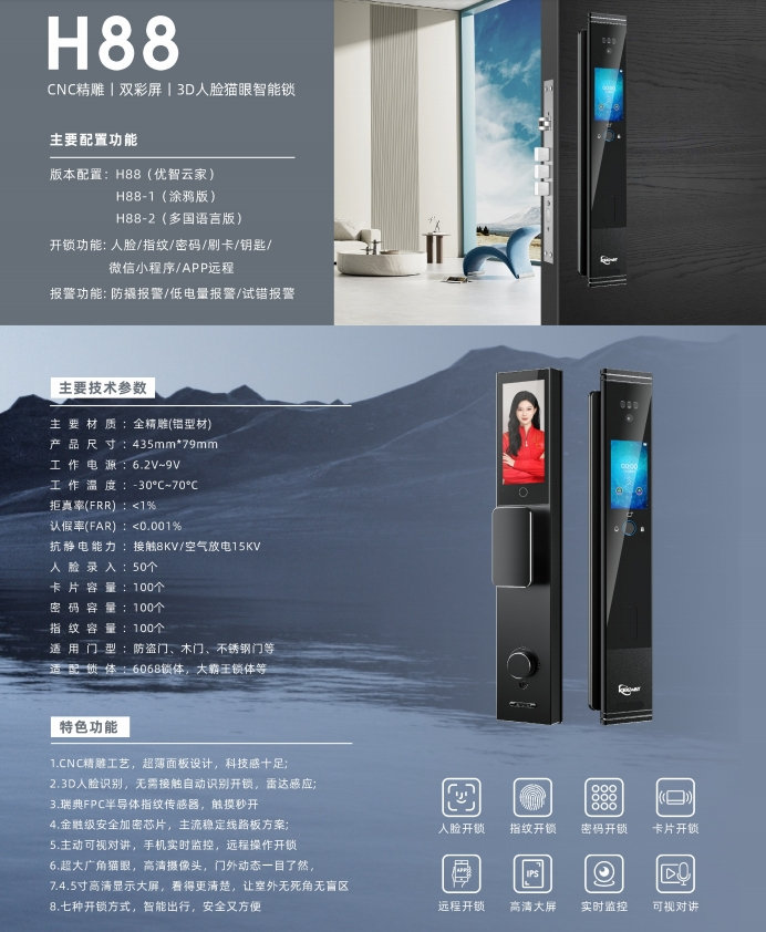 H88 CNC精雕|双彩屏|3D人脸猫眼智能锁