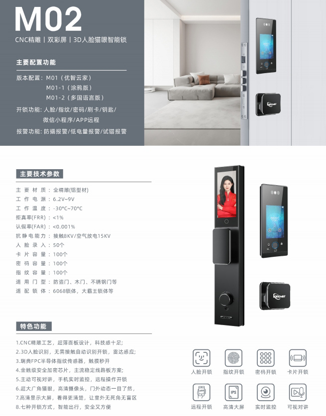 M02 CNC精雕|双彩屏|3D人脸猫眼智能锁