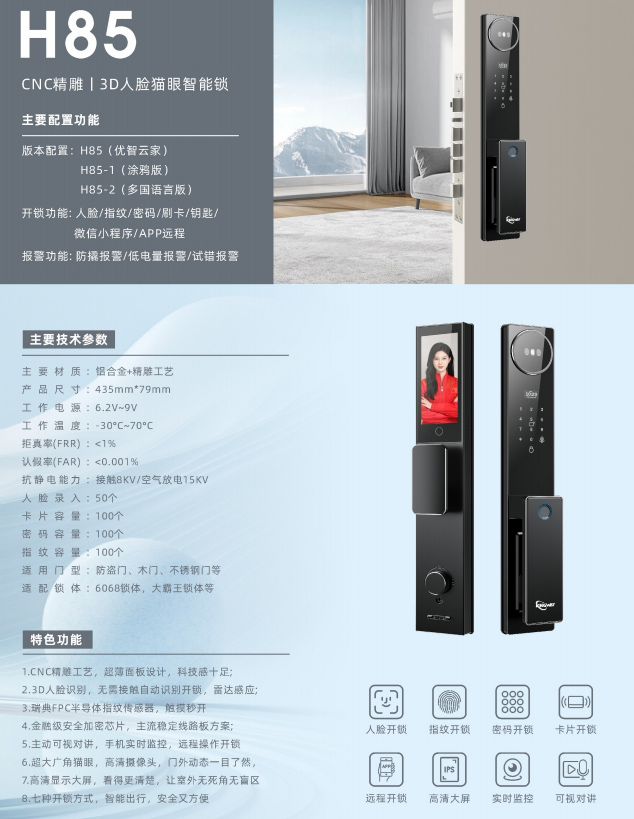 H85 CNC精雕|3D人脸猫眼智能锁